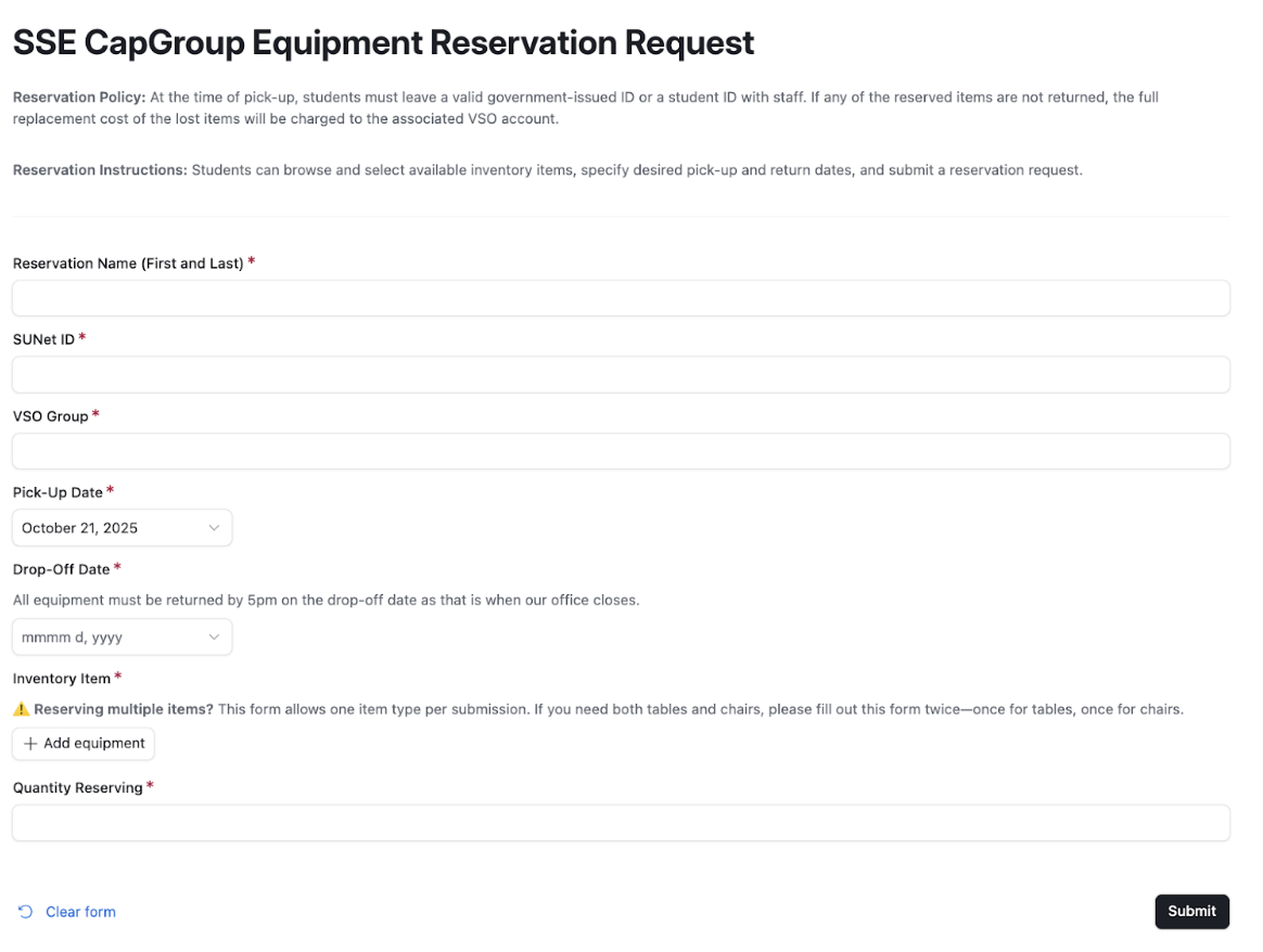 For any questions or additional assistance, please contact banking@sse.stanford.edu. We are committed to ensuring that the equipment reservation process remains efficient and accessible for all VSO groups.