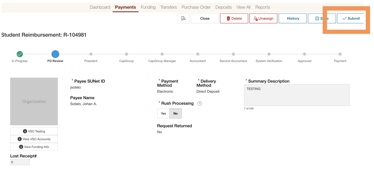 STEP 2: On the dashboard, select the "Payment" tab, or scroll down to "Recent Activity" and select requests that are listed as "In Review"